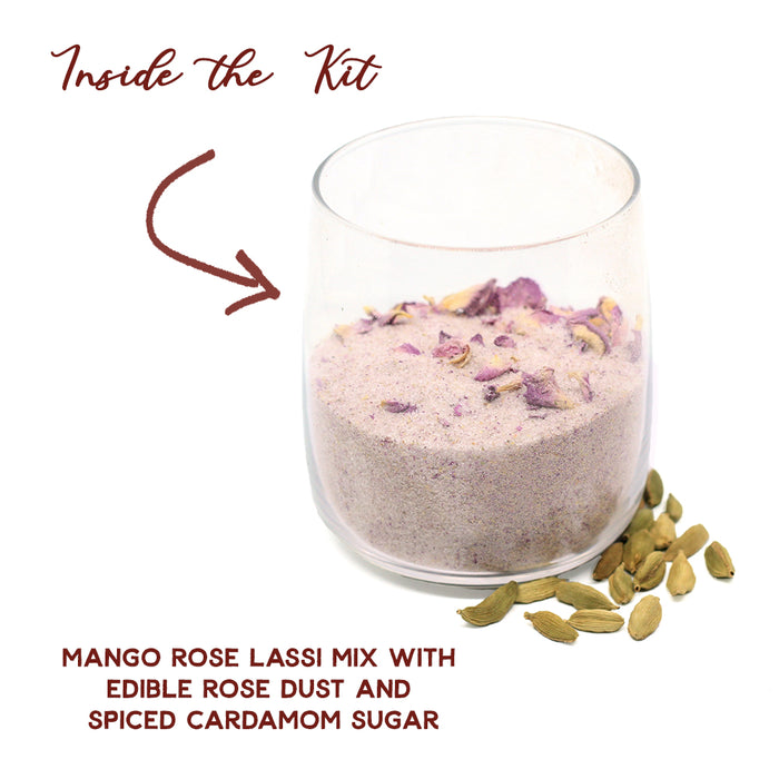 The lassi mix is made with organic edible rose dust and spiced cardamom sugar.