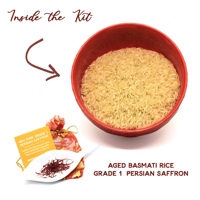 The kit comes with a bag of aged long grain Basmati rice and a small pod of grade 1 Persian saffron.