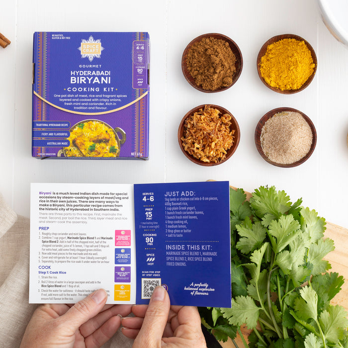 Any Biryani lover will tell you the perfect Biryani can take up to 24 hours to put together. But this kit is packed with clever tips and tricks to help you cook a sensational flavour packed dish in under 90 minutes (plus marinading time).
